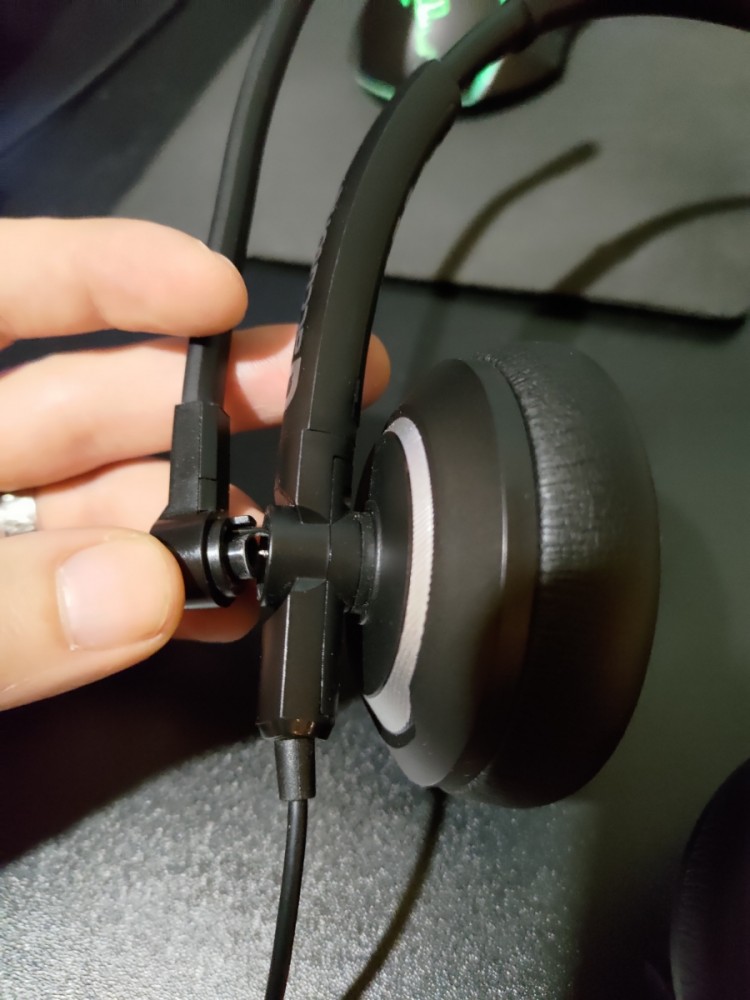 - Шнур имеет длину 240 см. На шнуре установлен разъем USB-C и переходник USB-A, привязанный к шнуру тросиком для предотвращения утраты. Два разъема делают гарнитуру универсальной и совместимой со многими устройствами.