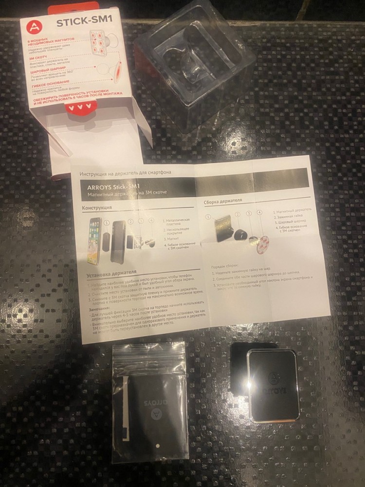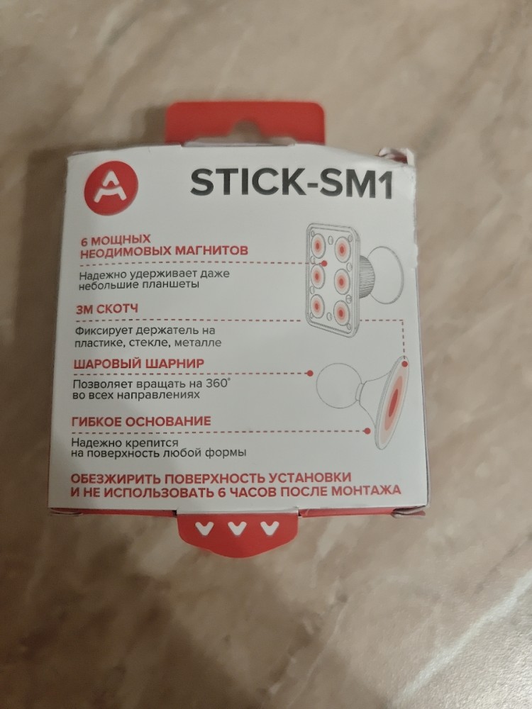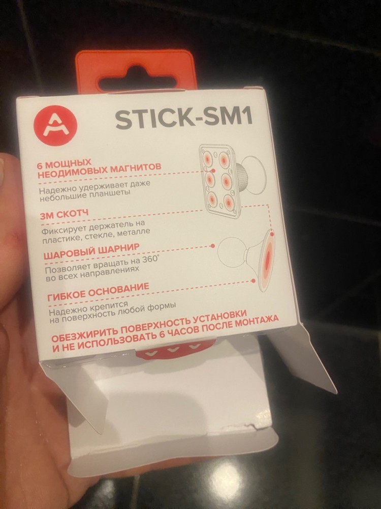 Магнитная "голова " Stick-SM1 содержит шесть неодимовых магнитов. Для крепления телефона на магнитной части используется металлическая пластина размером 45*65 мм. Она устанавливается на задней крышке телефона по центру с помощью скотча 3М. Если телефон с беспроводной зарядкой, то пластину надо сместить вниз, чтобы удалить ее от зарядной катушки. Телефон может использоваться и в тонком чехле или бампере, тогда пластина размещается между ним и чехлом. Прежде чем использовать установку пластины на скотч, необходимо проверить надежность крепления смартфона на магнитной части.