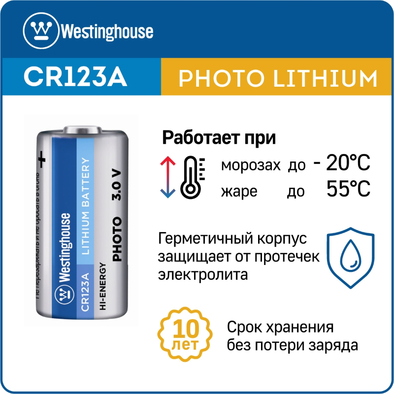 СR123A батарейка Westinghouse может эффективно работать при морозах до -20°С и жаре до 55°С, что делает ее идеальной для использования в электронных устройствах, работающих снаружи помещений. Полностью герметичный корпус защищает питаемые приборы от протечек электролита и как следствие выхода из строя. Новый элемент питания Westinghouse CR123A можно хранить до 10 лет практически без потери заряда за счет использования литиевого химического состава.