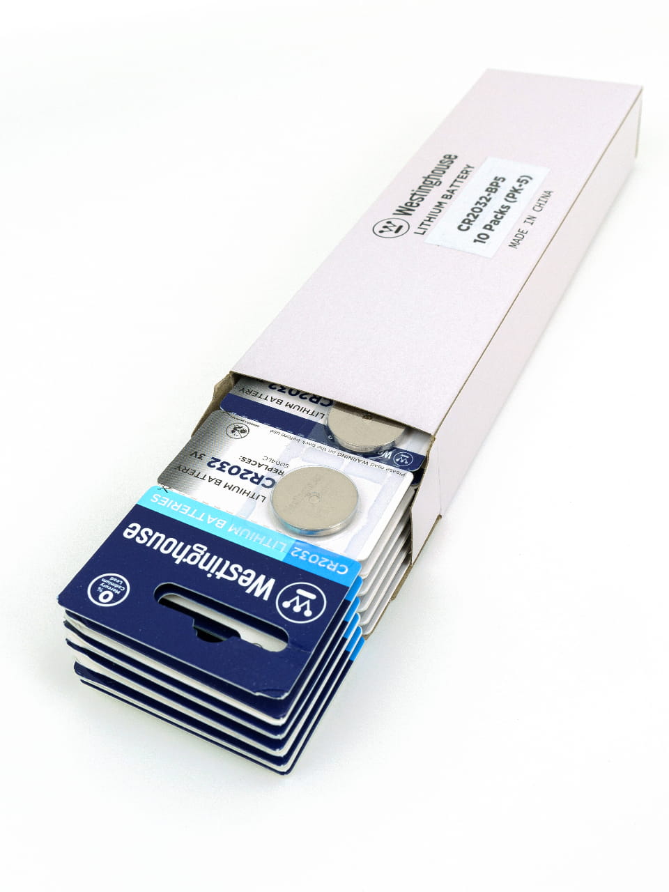 - Защитная упаковка от детей. Для обеспечения безопасности ваших детей батарейки-таблетки Westinghouse CR2032 поставляются в защитной упаковке от детей