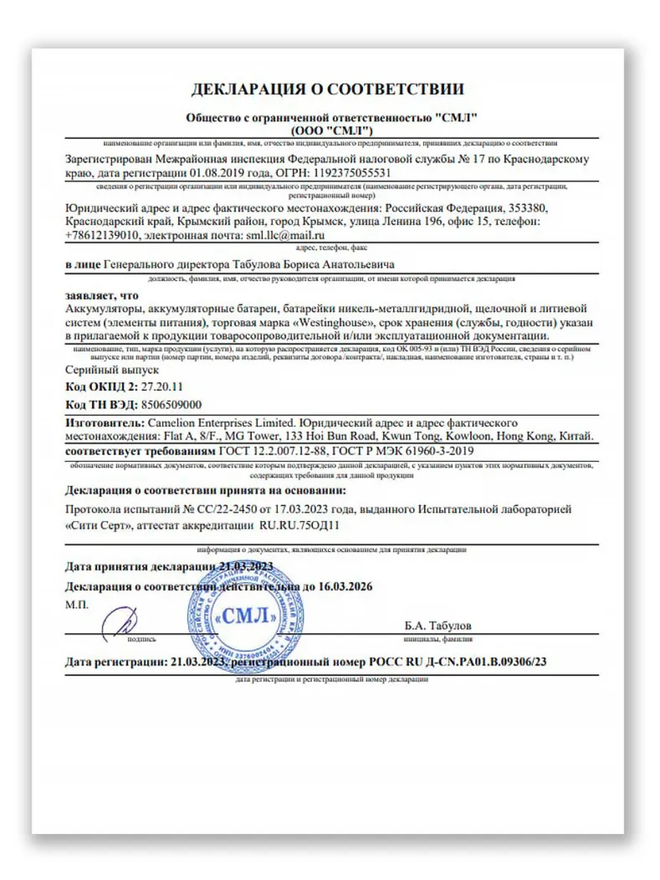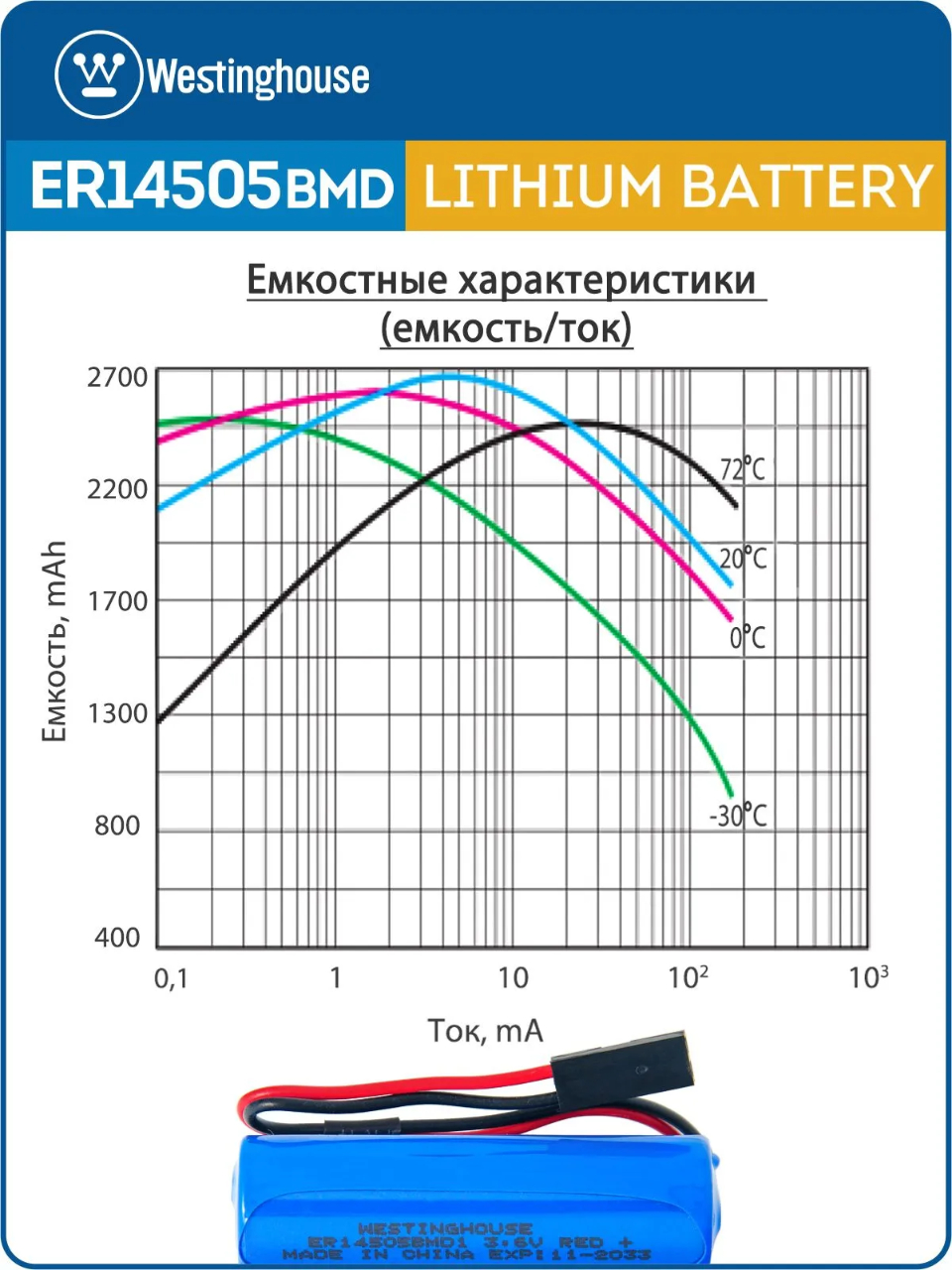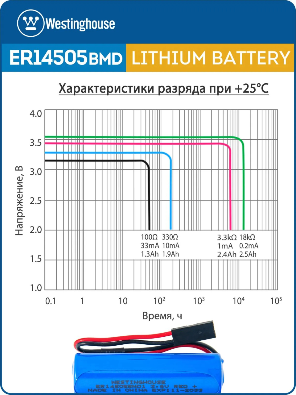 сверхнизкий уровень саморазряда, менее 1% за год при температуре хранения +20°С, обеспечивает долгий срок хранения и работы литиевой батарейки 3.6 Westinghouse ER 14505BMD1
